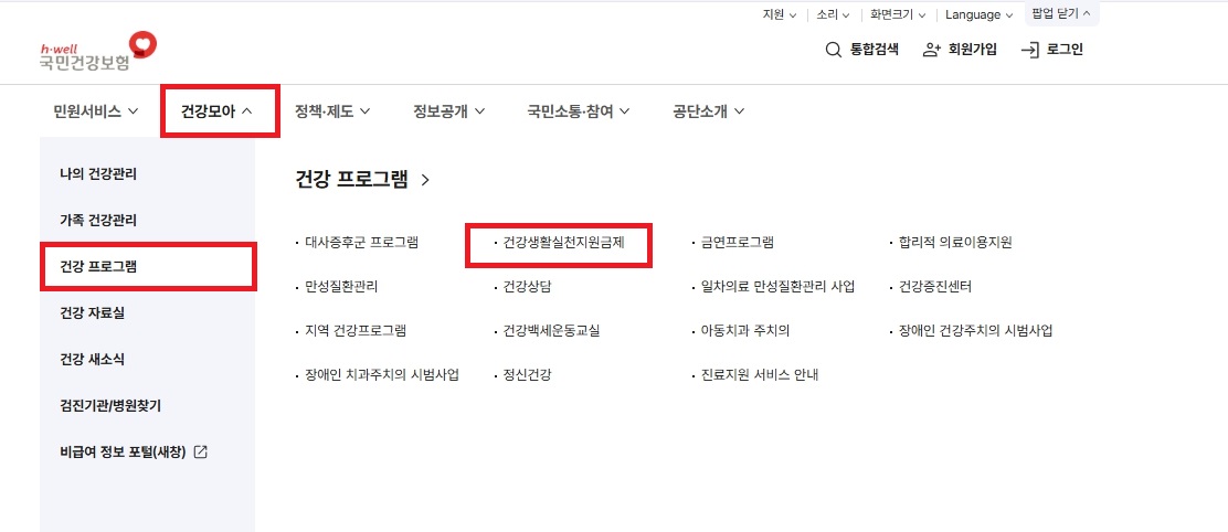 - 국민건강보험공단 홈페이지 접속 → “건강생활실천지원금제” 검색 → 참여 신청