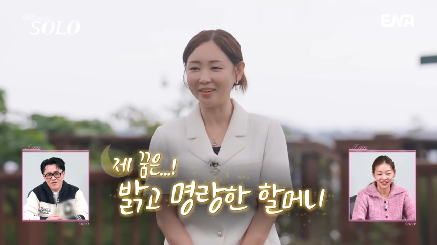 이상형은 외모와 경제력. 꿈은 ‘밝고 명랑한 할머니’가 되는 것으로, 함께 긍정적인 에너지로 나이를 먹어갈 할아버지를 찾고 있습니다.