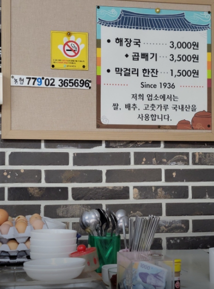 - 대표메뉴 : 해장국 3,000원 / 곱빼기 3,500원 / 막걸리 1,500원