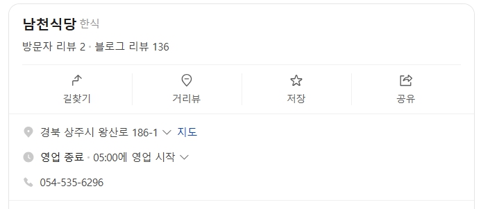 오래된 식당이지만 특유의 정겨움, 빠른 회전율, 그리고 단골들이 만드는 활기찬 분위기가 남천식당을 상주의 명물로 만들고 있습니다.