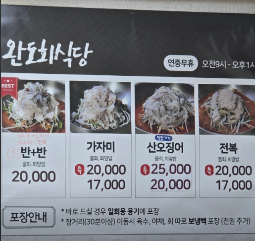 - 특징 : 30년 이상 운영한 물회 전문점, 산오징어·가자미 직송